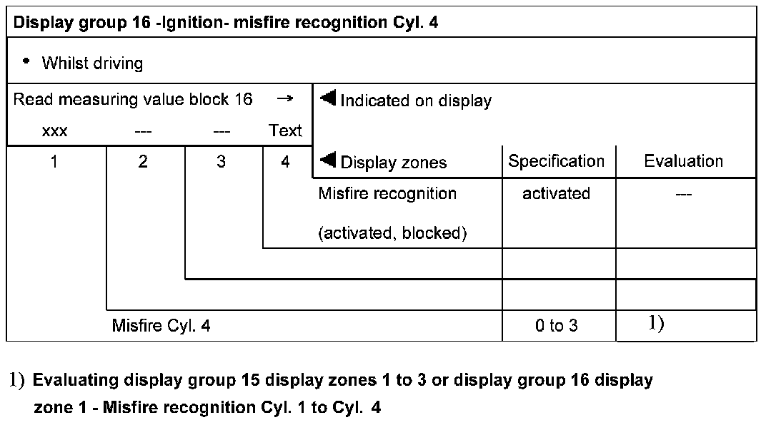 Evaluating display group 15 display zones 1 to 3 or display group 16 display zone 1 - Misfire recognition Cyl. 1 to Cyl. 4