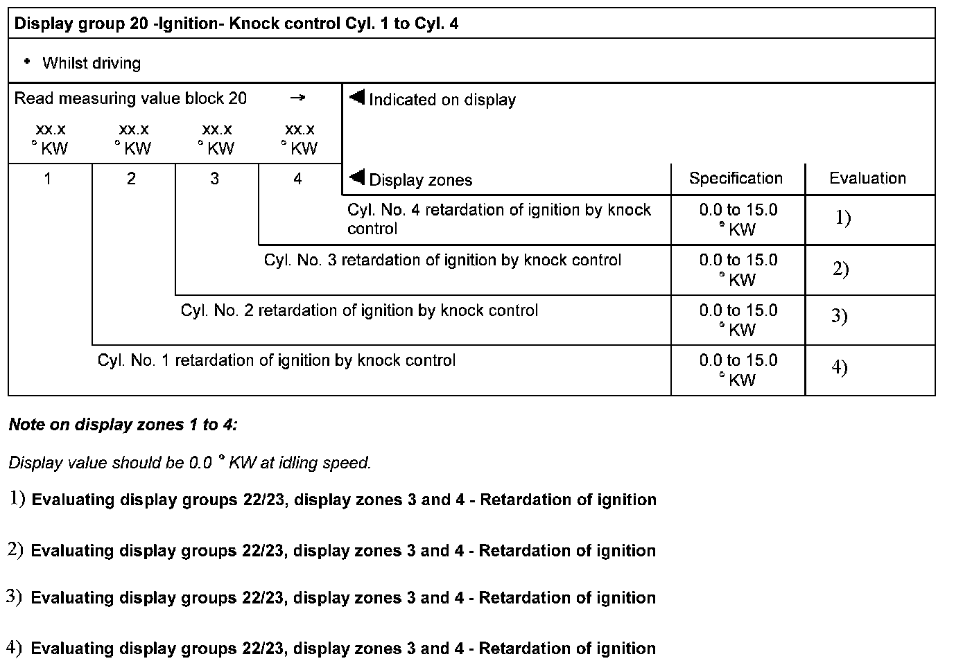 Display group 20 - Ignition- Knock control Cyl. 1 to Cyl. 4