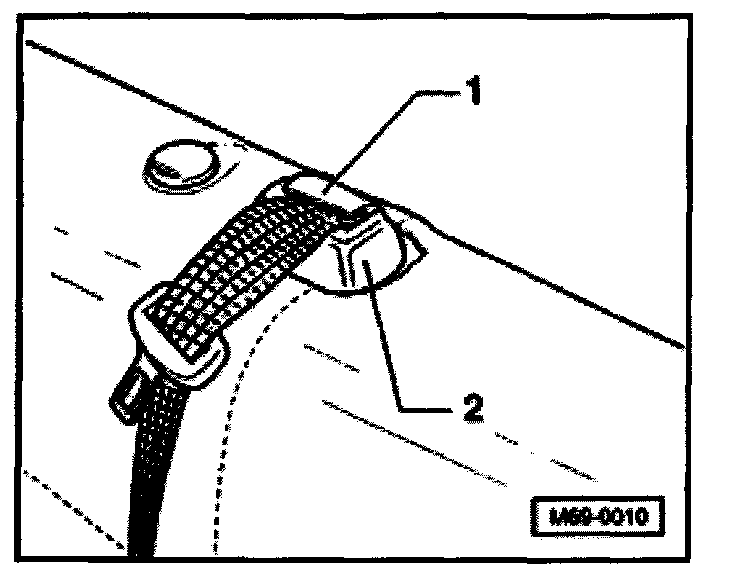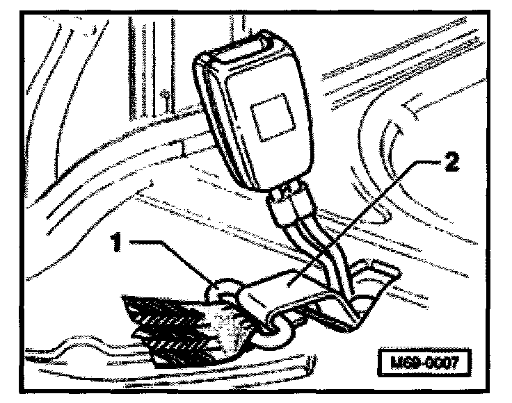 - Unhook seat belt bracket -1- from lower mount -2-.
