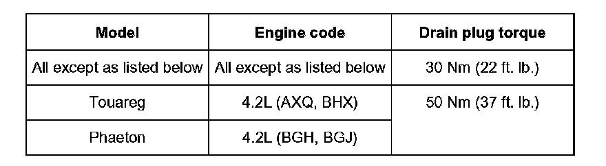 Do not exceed the specified torque. Exceeding the specified torque may damage the oil pan or bend the sealing washer, which can lead to leaks at the drain plug.
