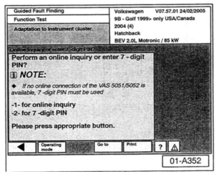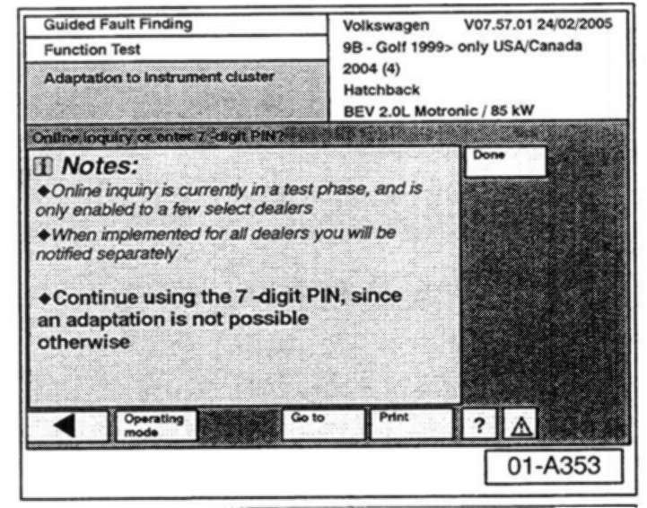 ^ The online GeKo process resolves the issue with 7-digit PIN codes beginning with "0" in Adaptation Channel 50 not being accepted by the Immobilizer when this code is entered into the Engine Control Module or Instrument Cluster (as described in VW Technical Bulletin Group 01 Number 04-21).