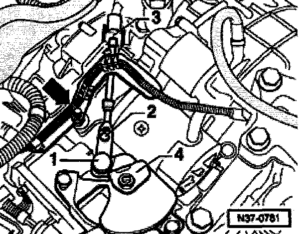 - Remove intake hose -1-, connector -2- and hose -3- from mass air flow sensor.