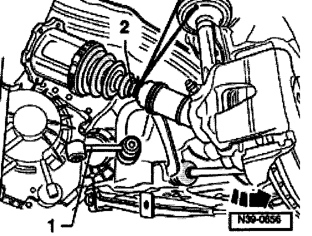 - Guide left drive shaft -2- out between sub-frame and transmission.