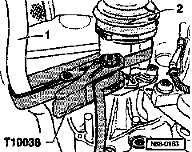 - Position tensioning strap T10038 around stabilizer bar -1- and right-hand drive shaft -2-.
