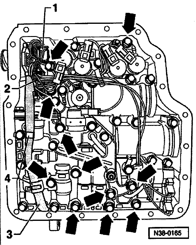 - Install valve body so that pin of detent segment engages in groove of manual valve -1-.