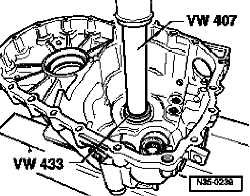 ^ Press in tapered roller bearing outer race together with determined shim (in example 1.75 mm) while supporting transmission housing with thrust piece 2050 directly under bearing support.
