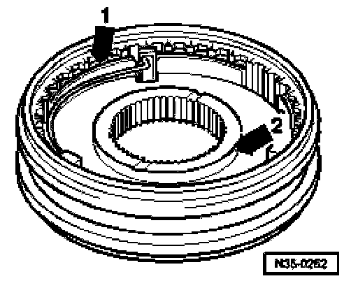 The lugs (arrows -1-) engage in the recesses (arrow 2) in the synchro-ring -B-.