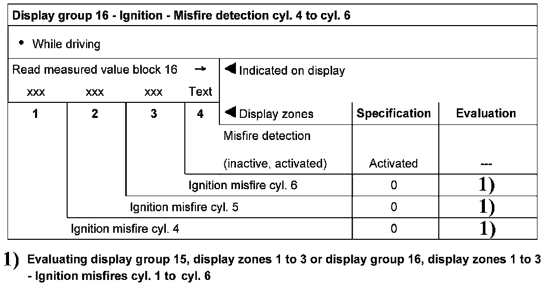 Evaluating display group 15, display zones 1 to 3 or display group 16, display zones 1 to 3 - Ignition misfires cyl. 1 to cyl. 6