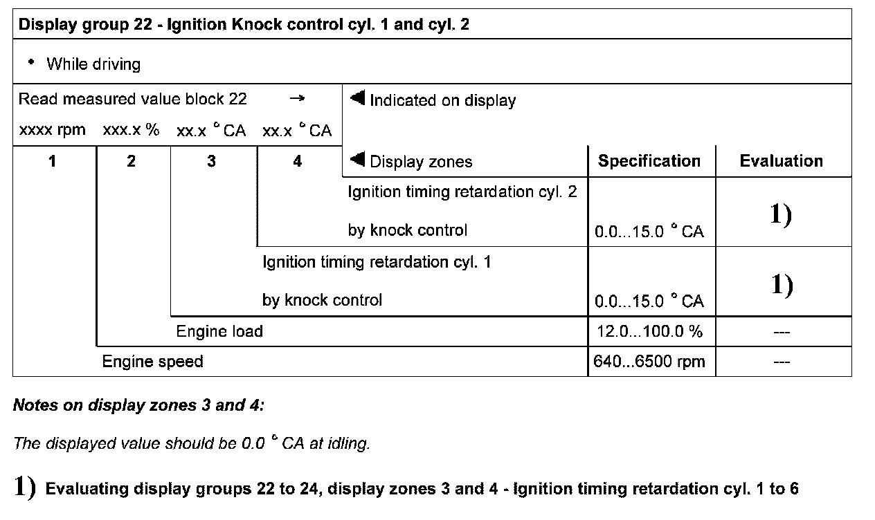 Display group 22 - Ignition - Knock control cyl. 1 and cyl .2