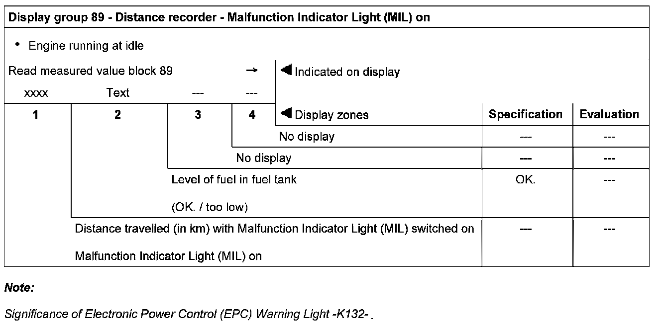 Display group 89 - Distance recorder - Malfunction Indicator Lamp (MIL) on