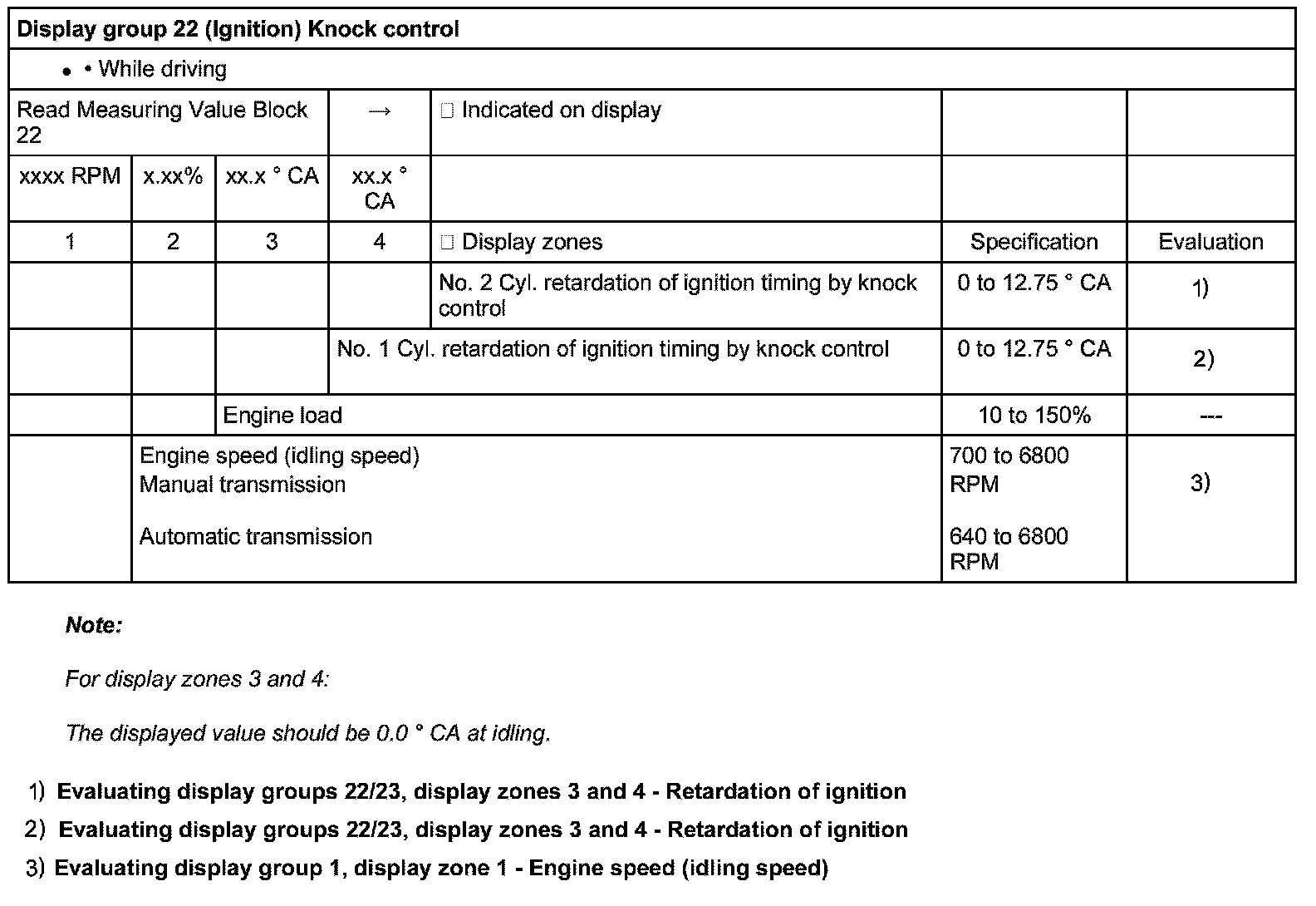 Evaluating display groups 22/23, display zones 3 and 4 - Retardation of ignition