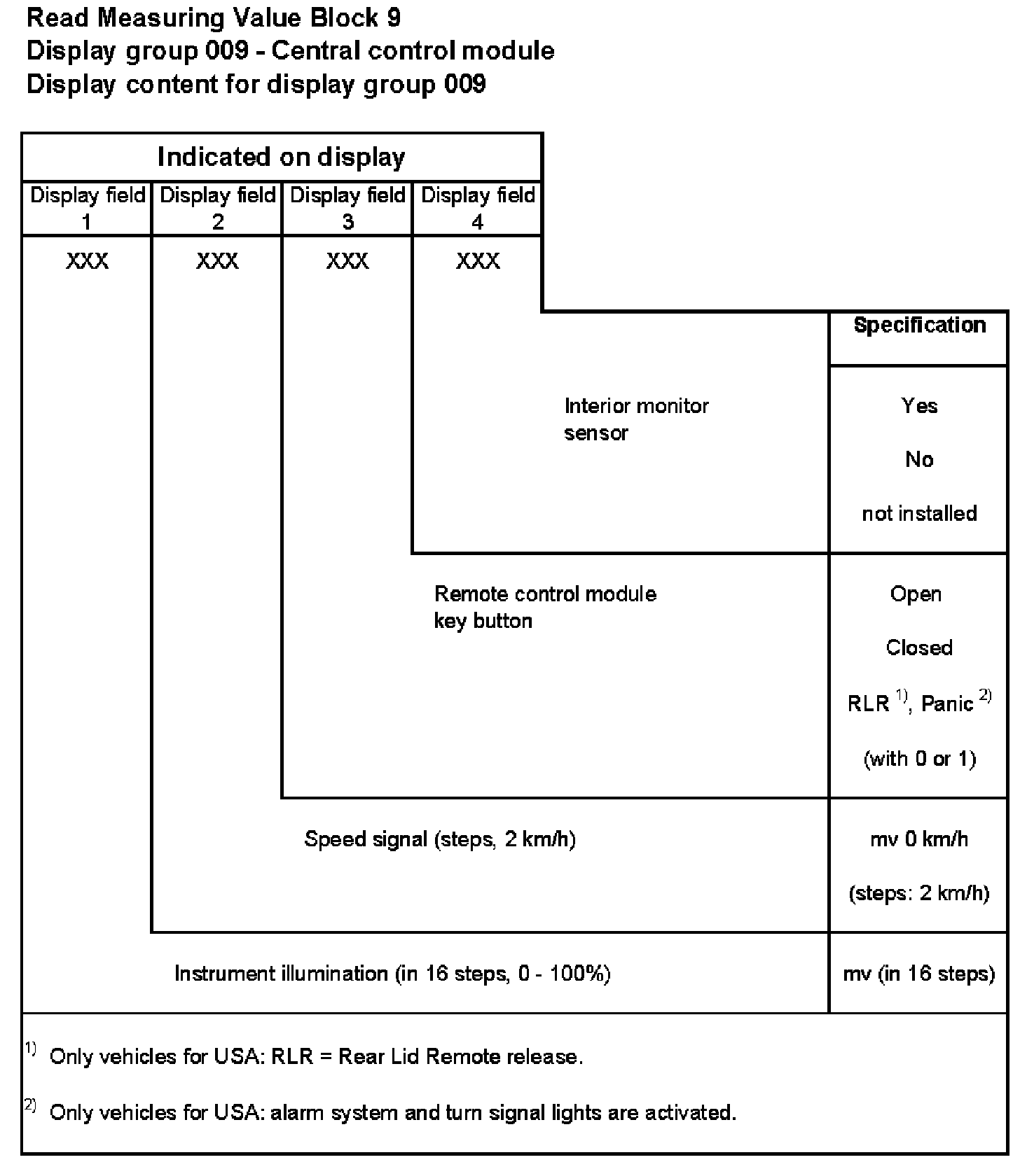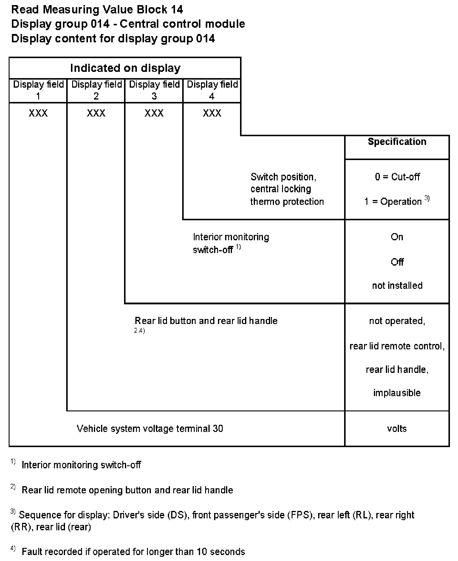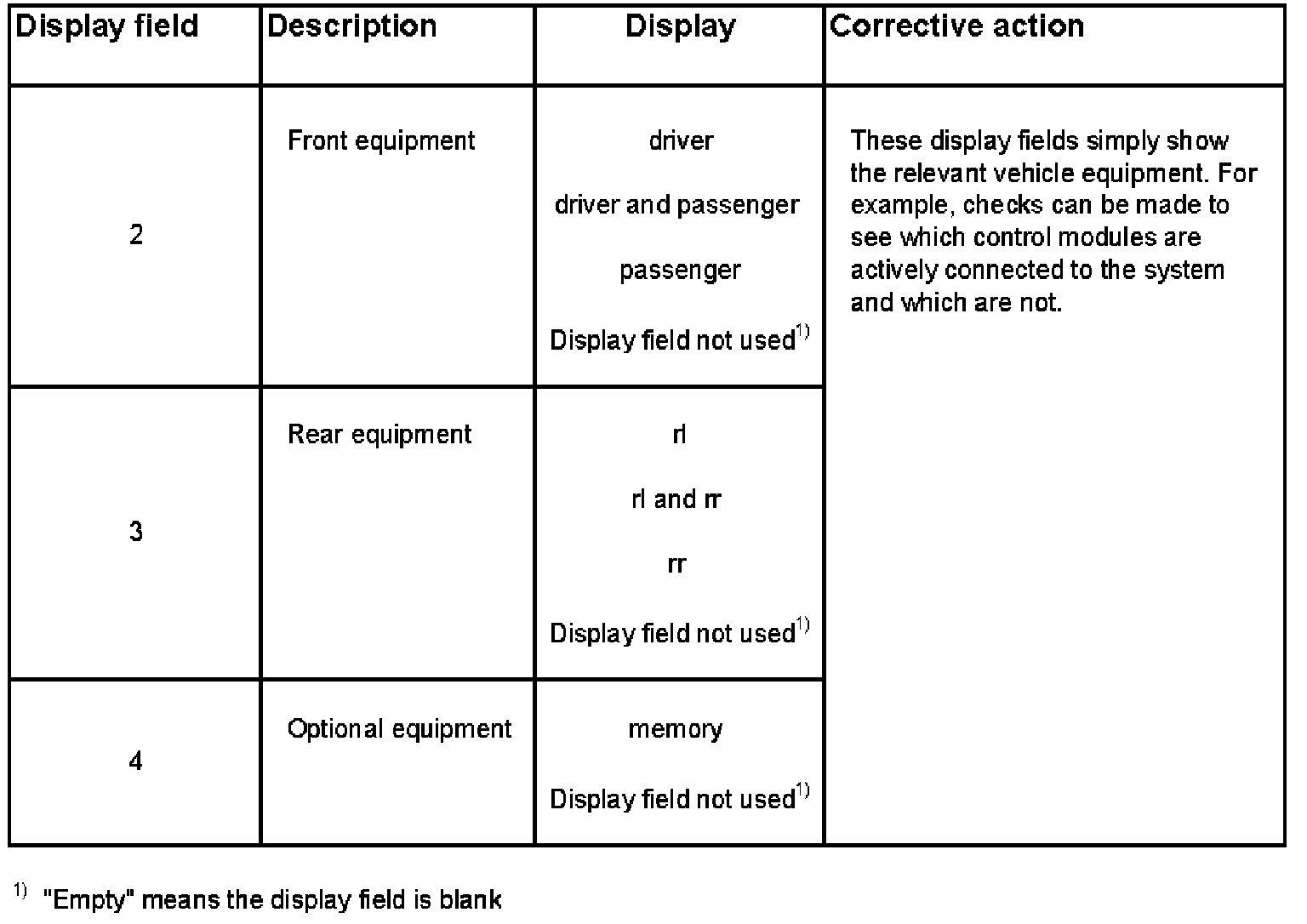 For example, if there is a malfunction in the driver's side door control module, display field 2 will indicate "passenger" only.