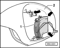 - Install mirror turn signal lamp - 1 - into mirror housing - 2 - as shown - arrows - and swing in - direction of arrow -.