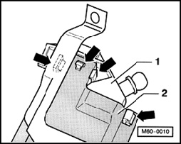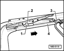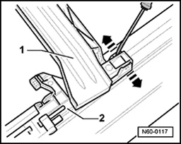 - Using a screw driver, disengage rain channel - 1 - carefully on both sides at bearing on guide catch - 2 - and remove.