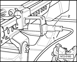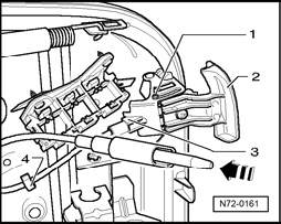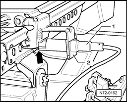 - Release tension on cable by pressing locking pin - arrow - and disengage at pin - 1 - in actuating lever - 2 -.