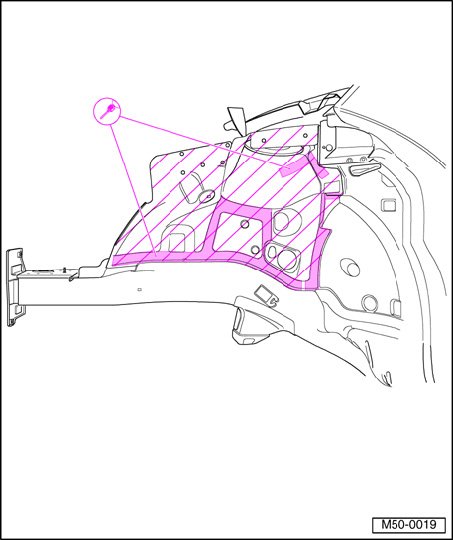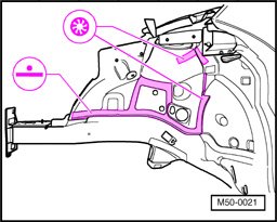 - Spot weld wheel house to lower longitudinal member, RP (electric resistance spot welding) spot weld seam.