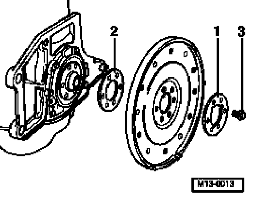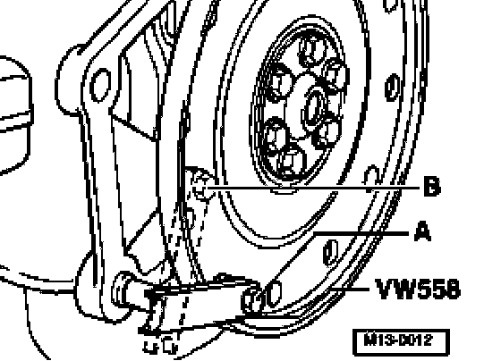- Secure VW 558 counter-hold tool to the drive plate with an M8x45 hex bolt. Place two M10 hex nuts between counterhold and drive plate.