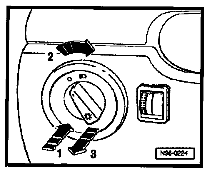 - Hold rotary knob in this position and by pulling on rotary knob remove light switch out of instrument panel (arrow -3-).