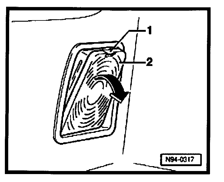 - Carefully pry out license plate light -2- with suitable tool until retaining tab -1- releases.