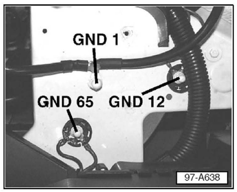 ^ Remove cap nut from stud GND 12 under battery tray.