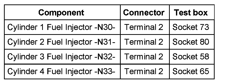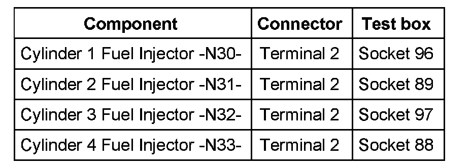 - The respective fuses of fuel injectors (N30 to N33) must be OK.