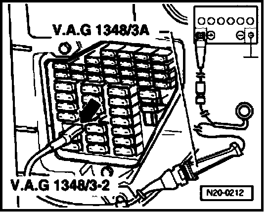 - Connect VAG 1348/3A remote control to Fuel Pump (FP) and B+ at terminal 28a using VAG 1348/3-2 remote control connection.