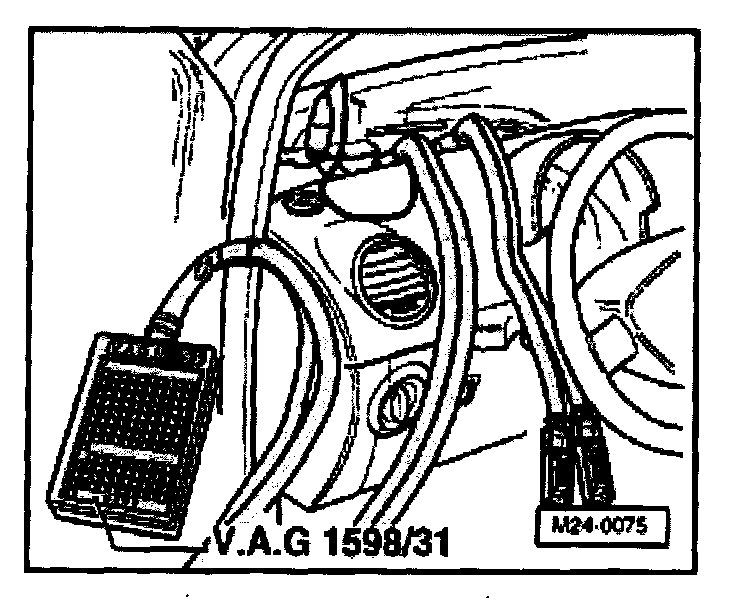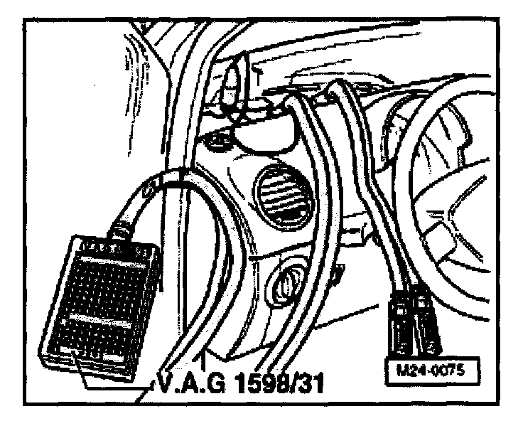 - Connect test box V.A.G 1598/31 to control module wiring harness. Engine control module is not connected by this action.