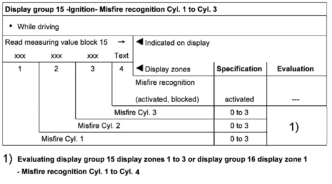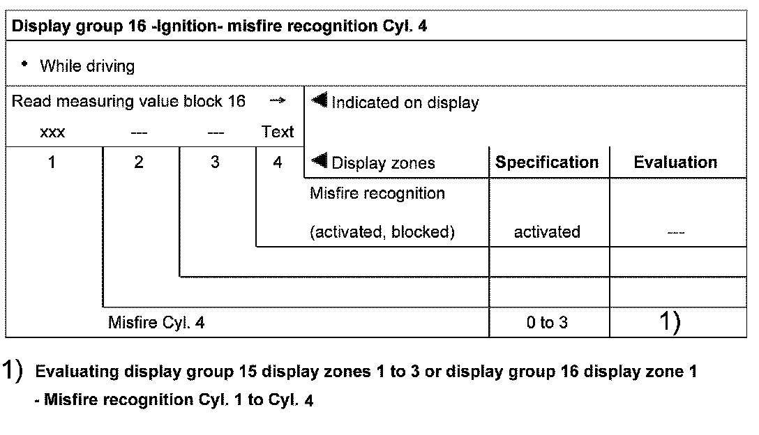 Evaluating display group 15 display zones 1 to 3 or display group 16 display zone 1 - Misfire recognition Cyl. 1 to Cyl. 4