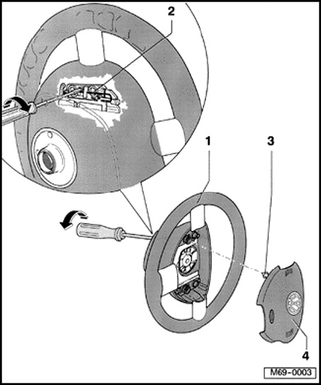 - Turn screwdriver - arrow - (for USA: insert Airbag Removal Tool (USA only) JC 1000 ). In this case, clamp - 2 - will be pressed down and the catch - 3 - of the airbag unit - 4 - will thereby disengage.