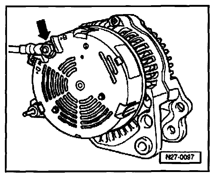 The tightening torque for the B+ wire (arrow) securing nut is 15 Nm (11 ft lb).