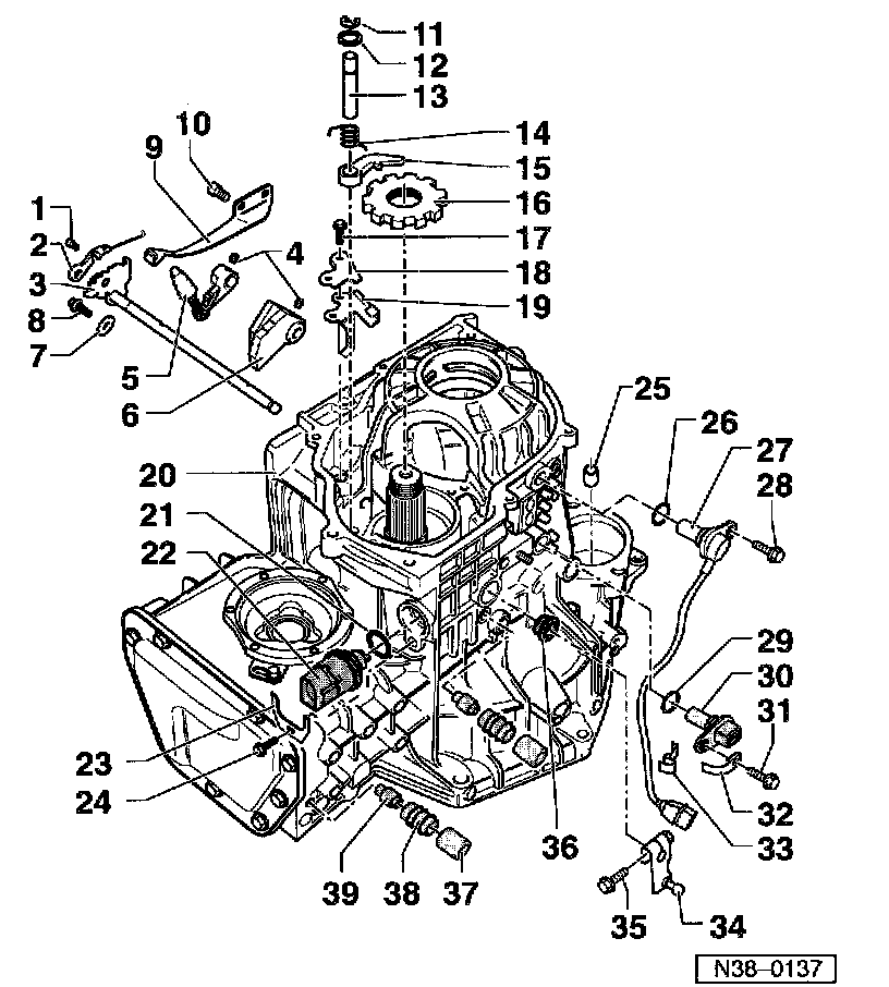 ^ Only drive out spring pin for engaging lever and spring pin for detent segment far enough to remove selector shaft.