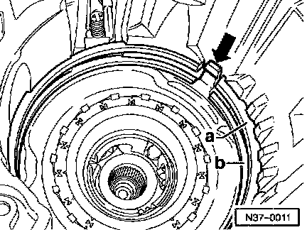 ^ Remove transmission housing cover with gasket -arrow-.