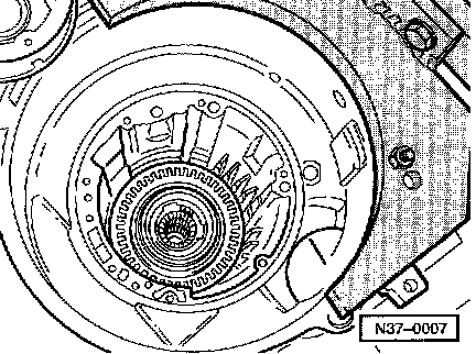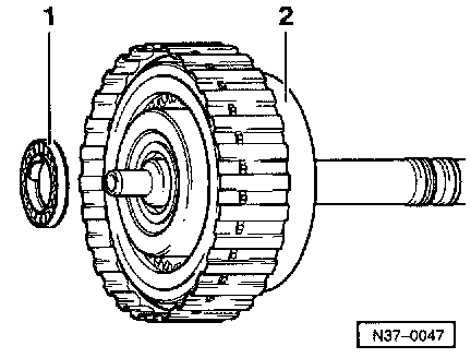 ^ Moisten axial needle bearing -1- and washer with ATF so that bearing, when installed , sticks to -2- 3rd and 4th gear clutch -K3-.