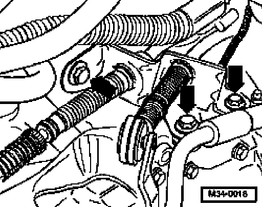 ^ Remove cable support bracket from transmission (arrows). If necessary unclip hose at cable support bracket first.