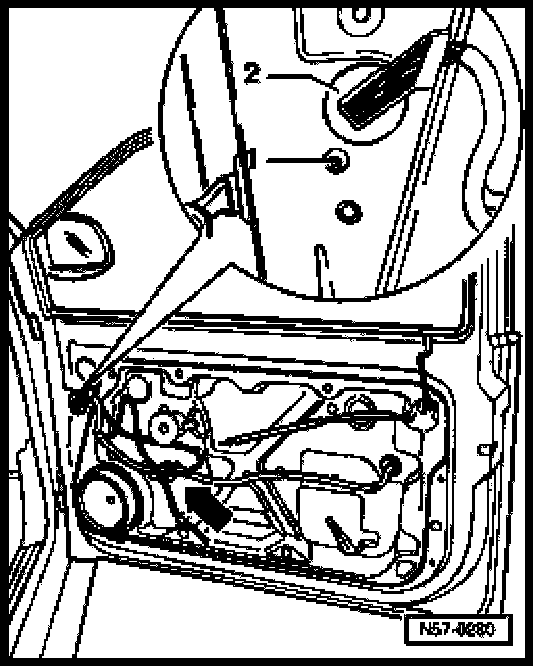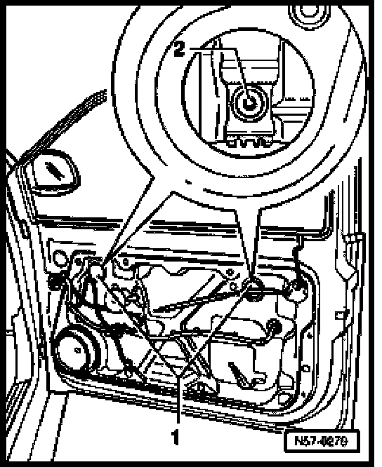 - Remove screw -1- and unhook wiring harness guide -2- from door.