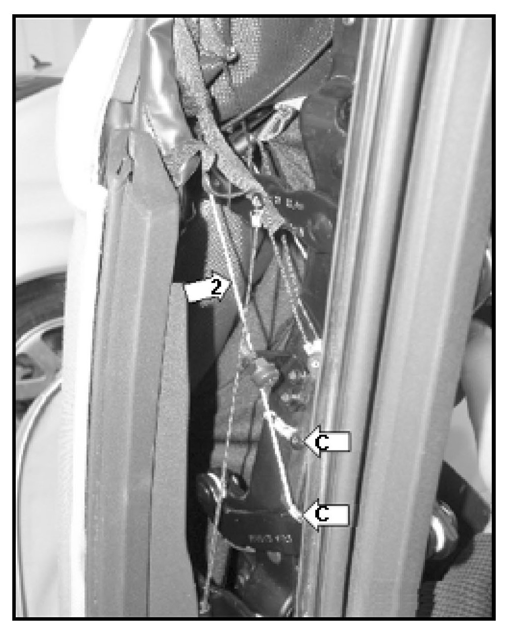- Long upper cable -2- is attached to outer part of convertible top frame -arrow C-