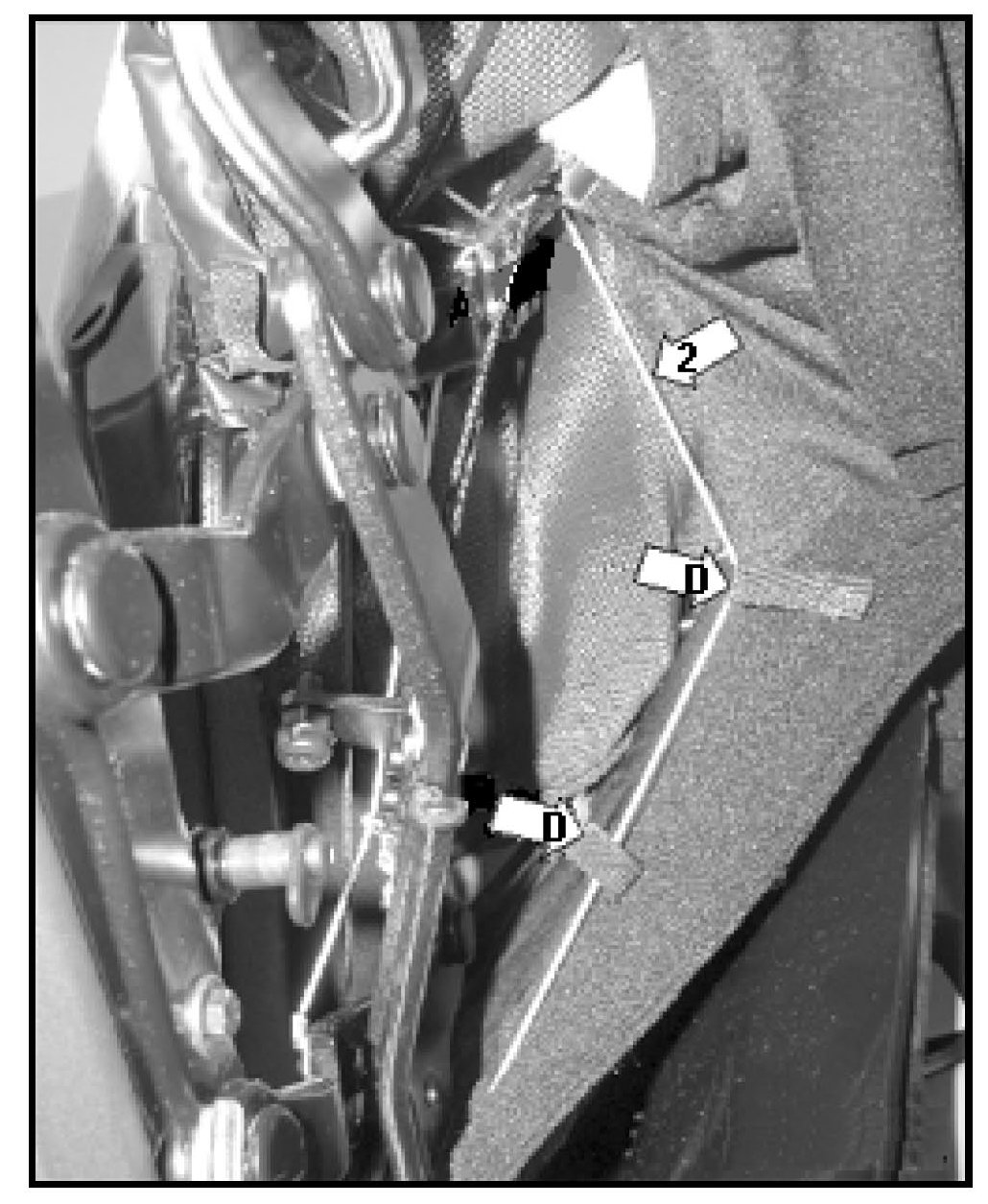 - Long upper cable -2- will be routed through convertible top fabric loops, if present -arrow D-, then attached to a retaining plate