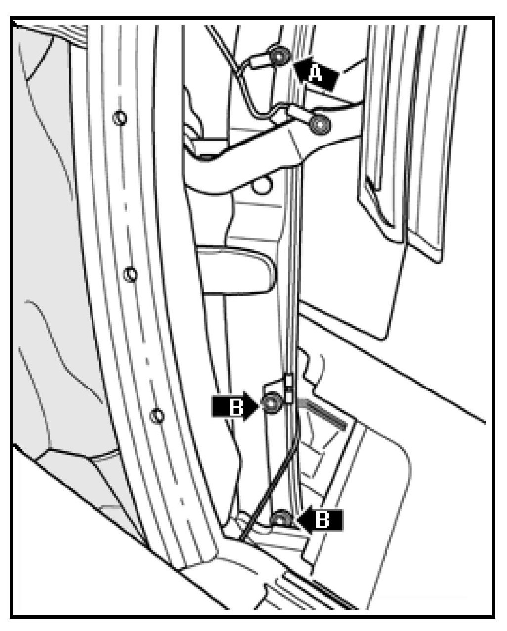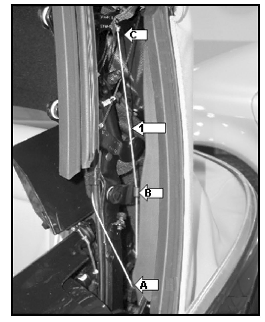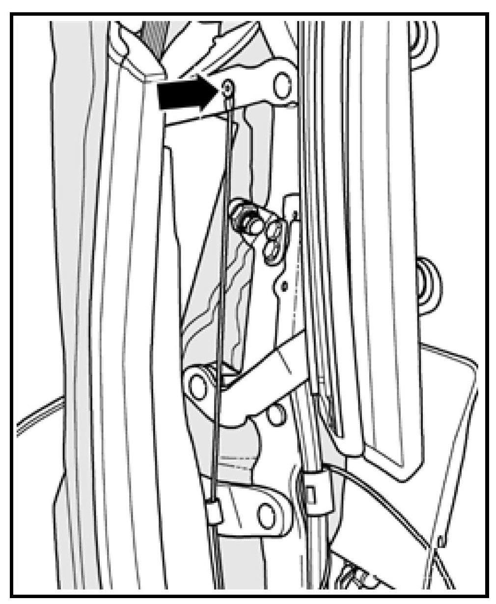 - Rotate cable guide -B- to a position that is forward of it s securing rivet