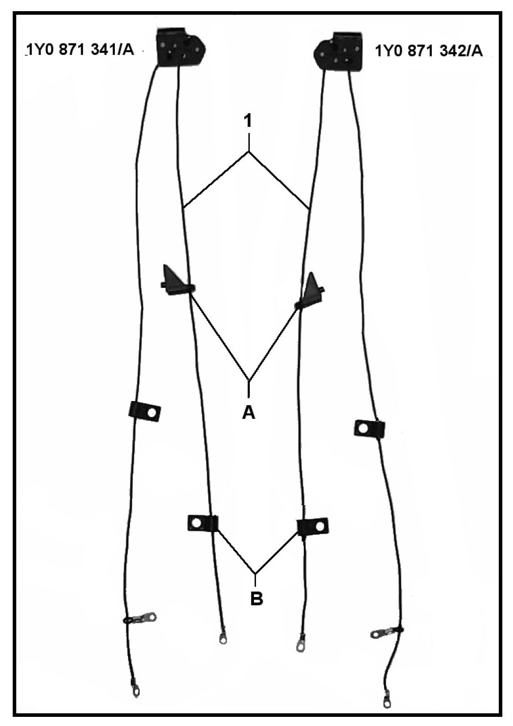 - Remove two cable guides -A- and -B- from short lower cable -1-