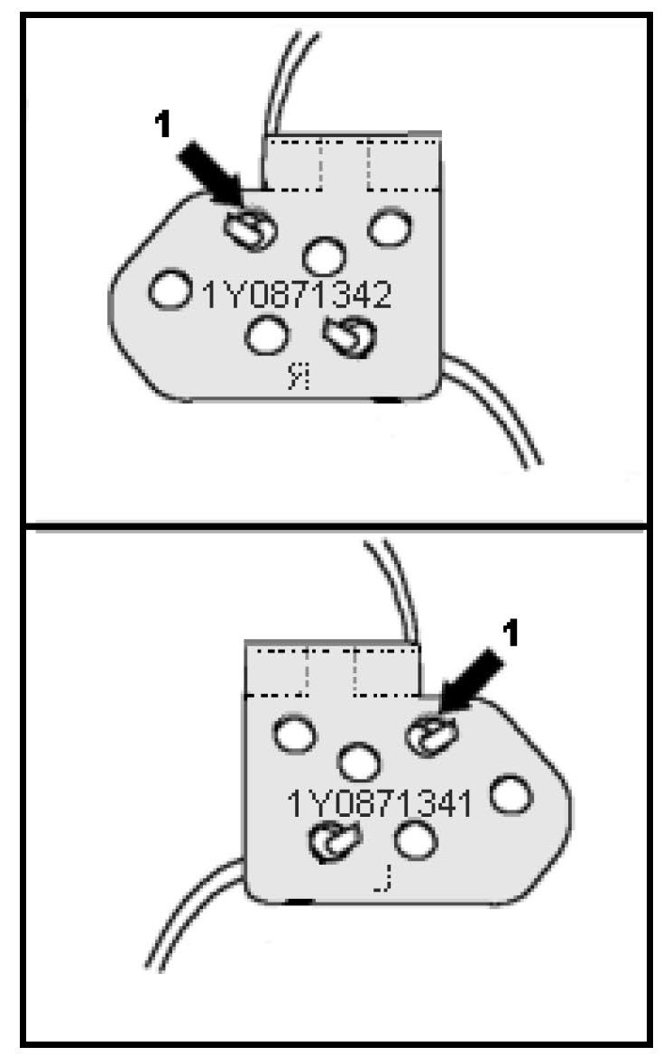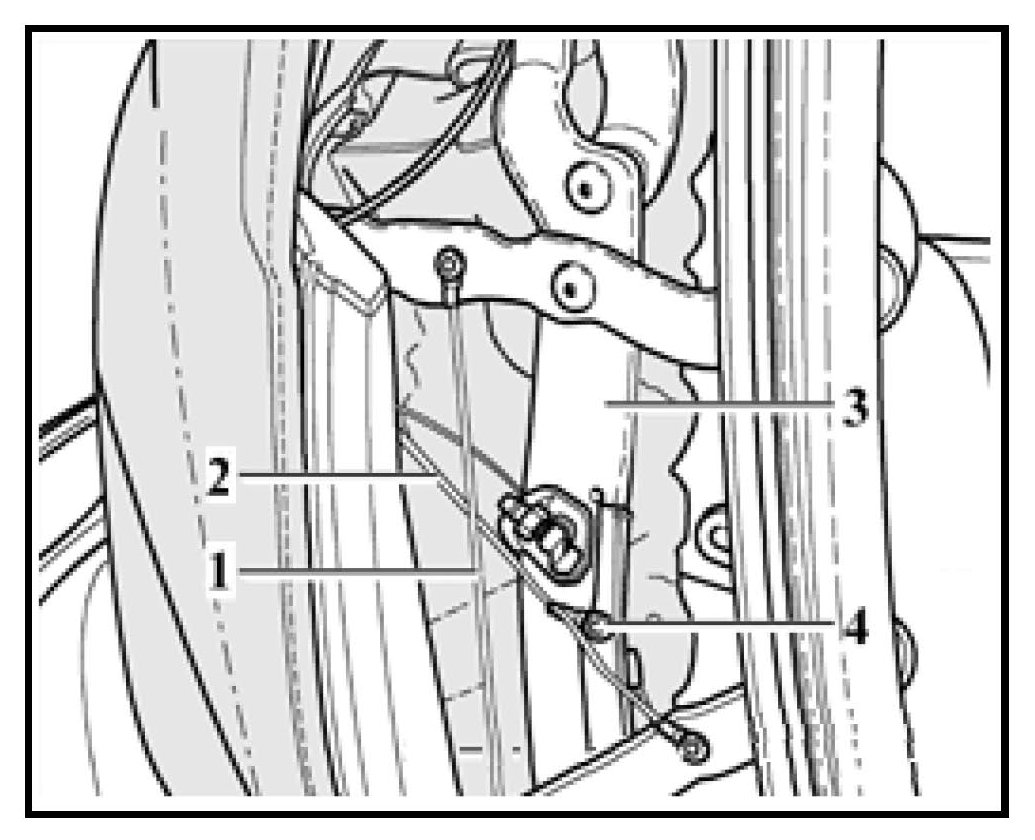 - Remove rivet -1- securing eyelet on the short lower cable