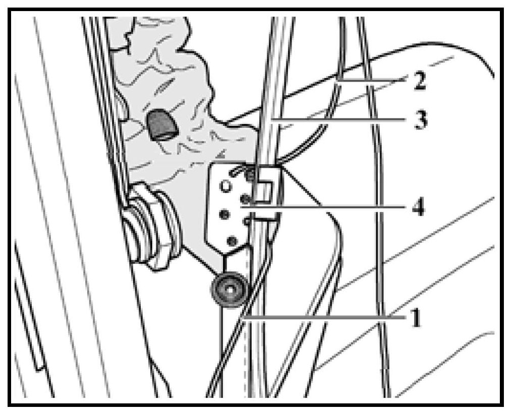 - Position sliding cable eyelet -4- at a 45° angle to guide rail, and using a rivet (1Y0 871 996 A) attach sliding cable socket -4- along with guide rail to the frame