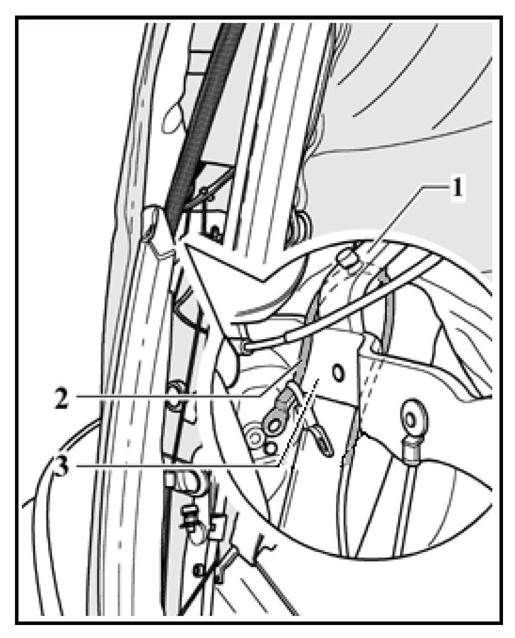 - Route long upper cable -2- between the short lower cable -1- and the frame -3-