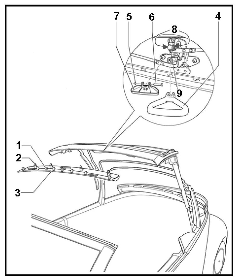 - Unclip roof frame trim panel -1- by prying off rear clips -3- then front clips -2-