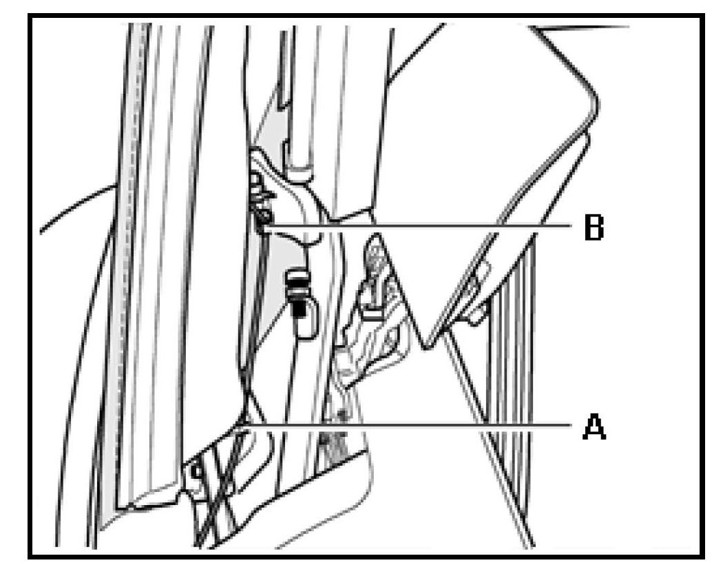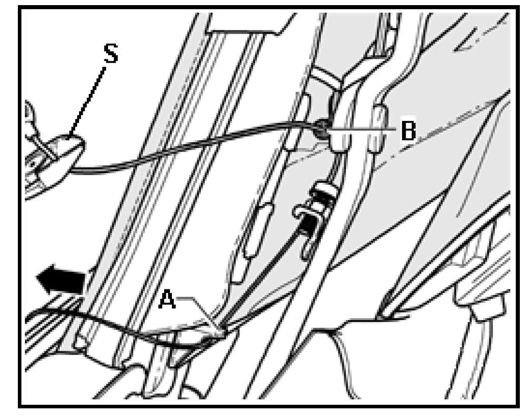 - Rotate cable guide -B- to a position that is forward of it s securing rivet