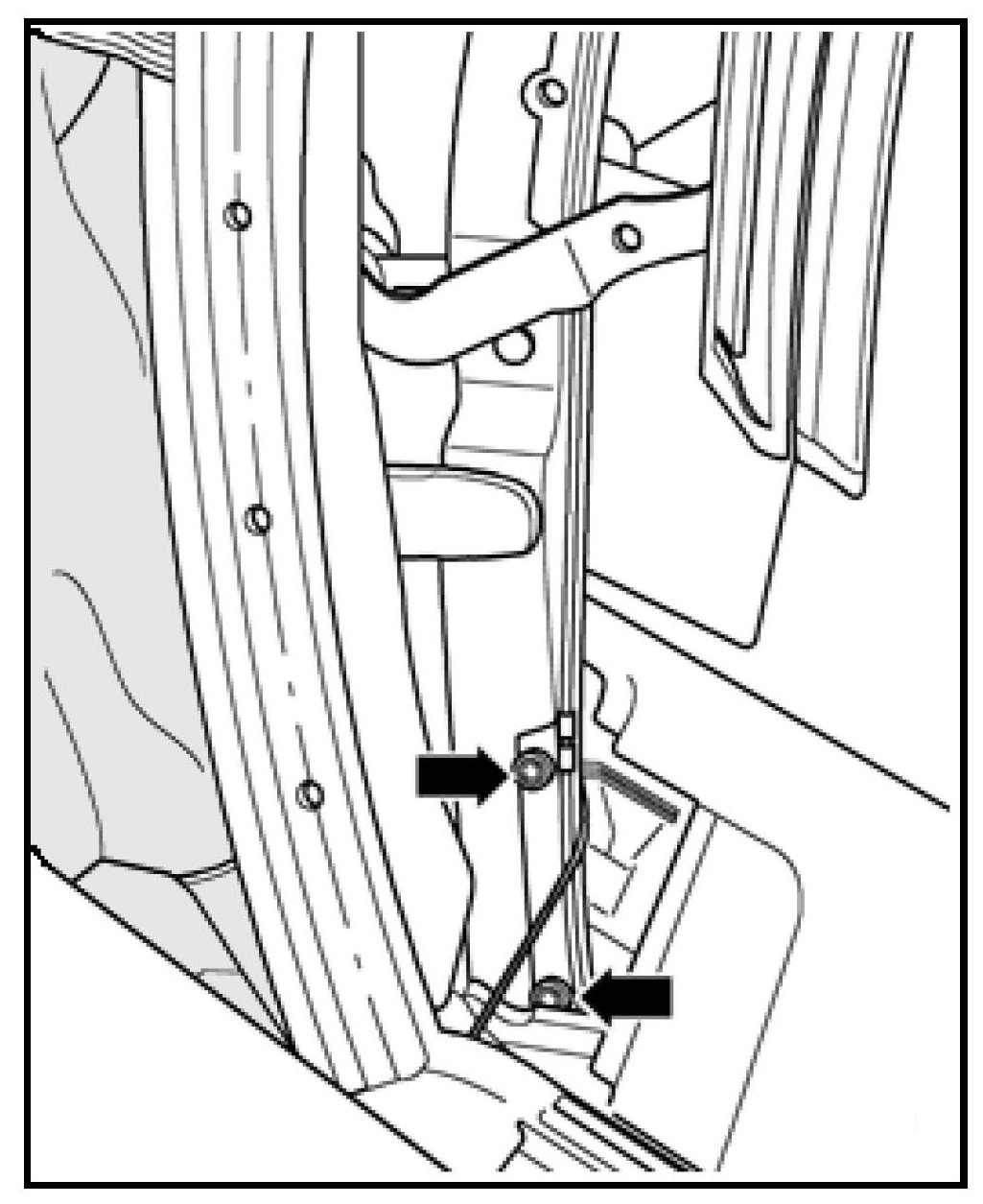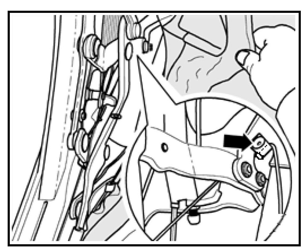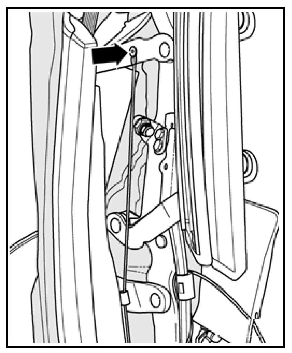 - Move headlining aside and remove rivet -arrow- attaching cable guide (with bushing) or elastic strap to the frame