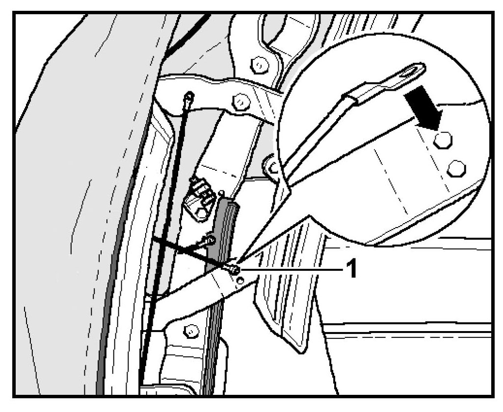 - Using a rivet (1Y0 871 996 A) secure cable eyelet -1- to upper hole -arrow- in frame