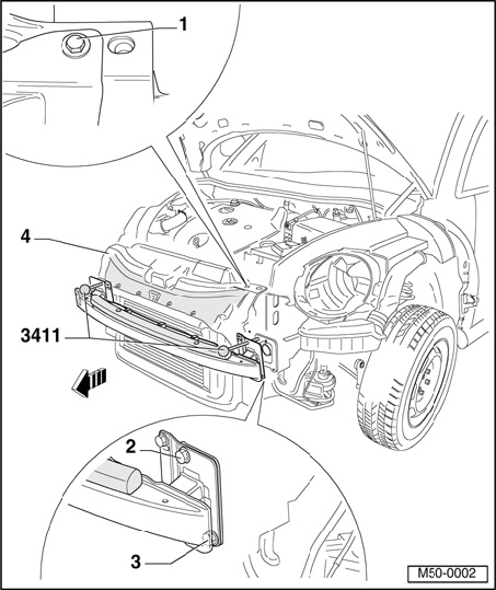 - Remove bolts - 1 - and - 3 - at left and right and pull lock carrier toward front in area of Support Tool 3411.