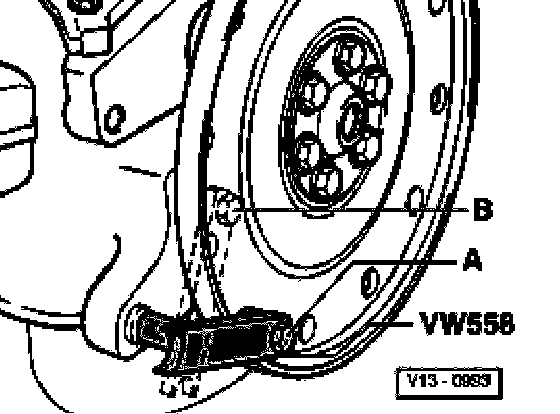 ^ Secure counter support tool VW 558 to drive plate with a M8 x 45 hex bolt. Place two M10 hex nuts between counter support tool and drive plate.