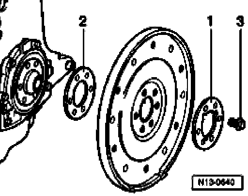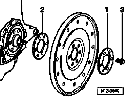 ^ Remove drive plate again and install shim -2-. Again tighten bolts -3- to 30 Nm.