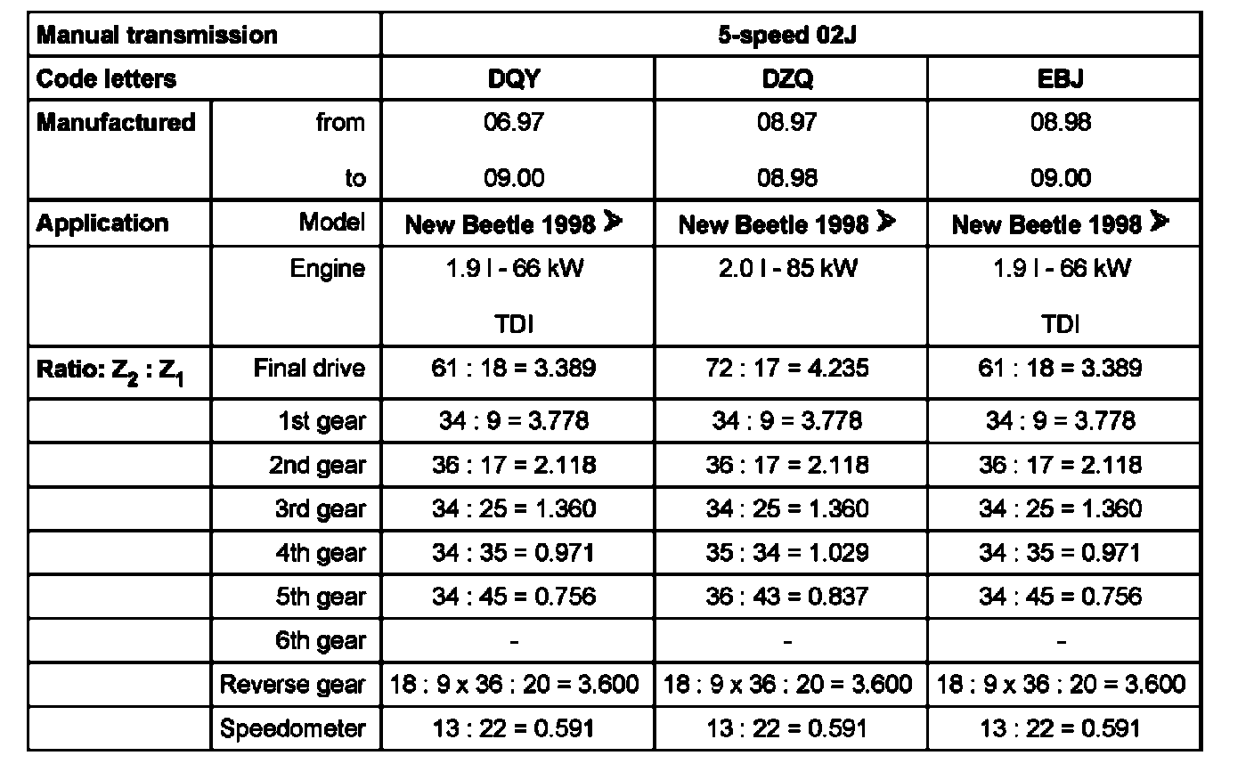 Code letters, transmission application, ratios, capacities